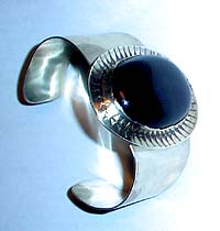 A bracelet of heavy sterling silver and New Mexico Obsidian. The stone is 27x39 and the central medallion is 55 mm high. $235.00 #590