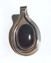 A pendant of high quality Hematite and Sterling Silver. Like obsidian, hematite is black, but is more reflective than obsidian. Again, note the reflections show in the stone. This is a rather large and showy pendant. The stone measures 30x39 mm and the piece is 83 mm high. $195.00 #382