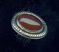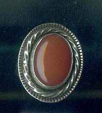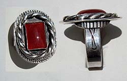 Another interesting ring of Sterling Silver and African Carnelian, size 10. It has an 11x14 mm rectangular stone of very fine color and a very pleasing design. $185.00 #638