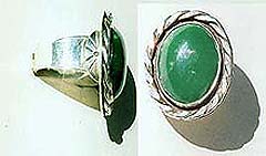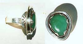 A Sterling Silver and Chrysoprase ring. The size is 10. The stone is another full-bodied green of very nice color and measures 16x20 mm. This would be a nice ring for either a man or a woman. $285.00 #292