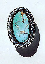 A ring of Sterling and Turquoise from the Pilot Mountain mine in Nevada. This is a pellucid stone with excellent matrix and pattern. The ring size is 9, and the stone is 15x23 mm. $175.00 #255