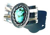 A nice bracelet constructed of Sterling Silver and 23.5 Cts. of excellent Turquoise from the Pilot Mountain mine in western Nevada. The stone measures 16x26 mm. $425.00 #436